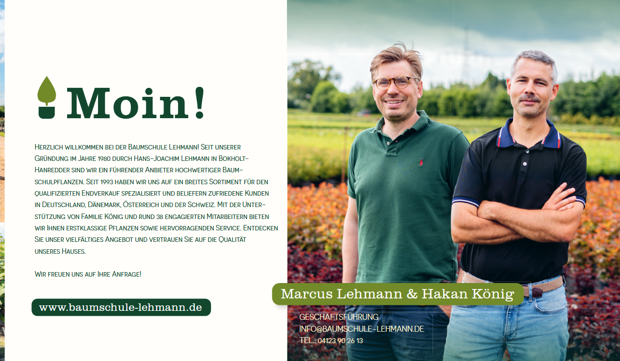 Als „echte Norddeutsche“ kennen unsere Pflanzen das abwechslungsreiche Wetter und auch mal eine „steife Brise“. Unser Betrieb erstreckt sich auf ca. 10 Hektar und hat sich auf die Kultur von Qualitätspflanzen spezialisiert. Unsere Stärke liegt in unserem großen Sortiment. Wir haben mehr als 1500 verschiedene Sorten in der Kultur. Im Bereich Pflanzenschutz, wie auch bei den Werbematerialien legen wir Wert auf Nachhaltigkeit. Wir versuchen mit unseren Themenwelten unsere Kunden im Verkauf zu unterstützen. Erlebe viel Inspiration pur rund um Garten,Pflanzen und Themen.